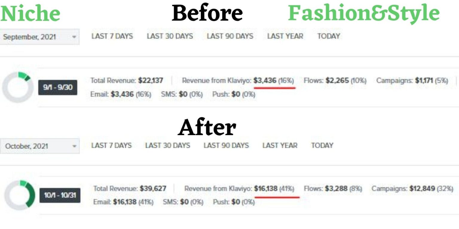 41% of Total Revenue from Email in the Fashion & Style Niche – Before working with us? 16% of total revenue. After? 41%. No extra ads. Just email.